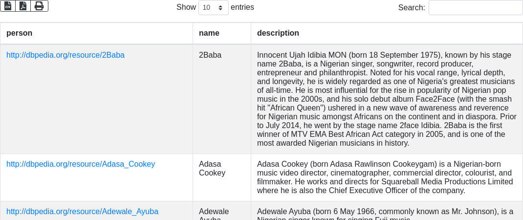 If you see a shield icon Insecure content shield icon appearing in the address bar (right side), you can click on this icon to download the insecure content. See details This query collates a list of musicians born in Nigeria, from DBpedia (Static Edition)