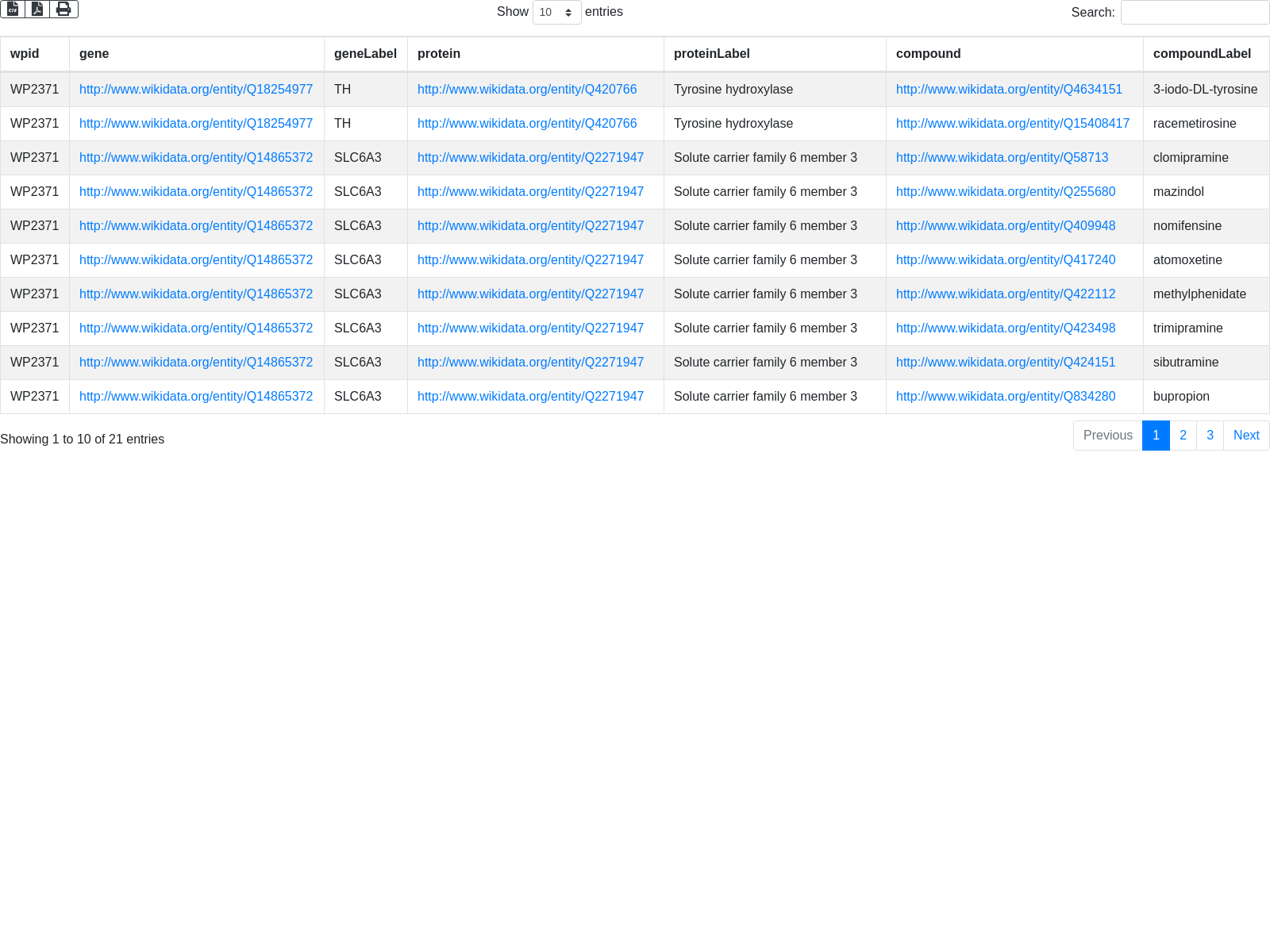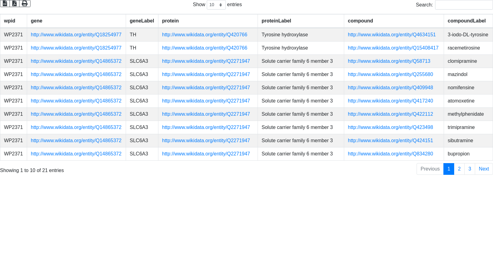 SELECT ?wpid ?gene ?geneLabel ?protein ?proteinLabel ?compound ?compoundLabel