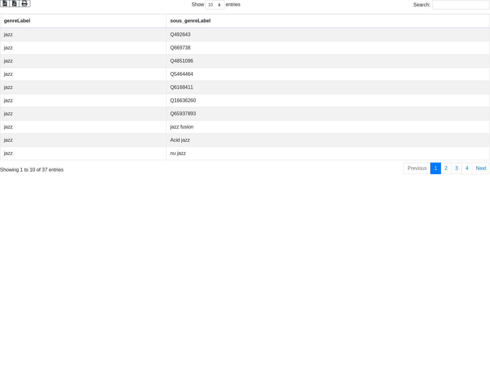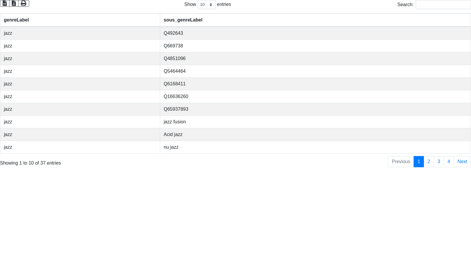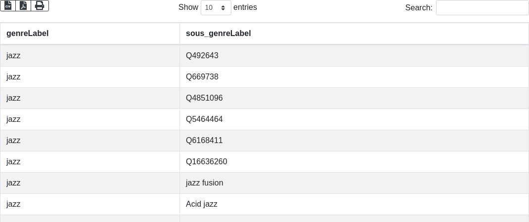 # Trouver un moyen de récupérer la valeur Q de chaque genre (e.g. "Q8341" par jazz) et la remplacer dans la valeur si dessous