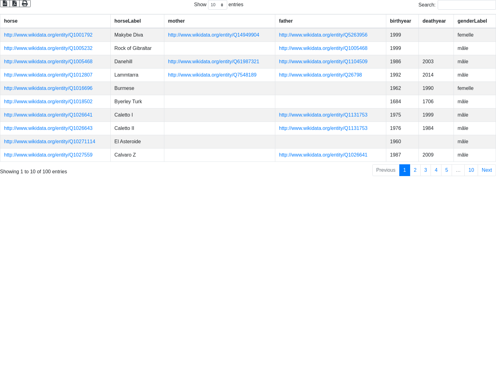 SELECT DISTINCT ?horse ?horseLabel ?mother ?father (year(?birthdate) as ?birthyear) (year(?deathdate) as ?deathyear) ?genderLabel