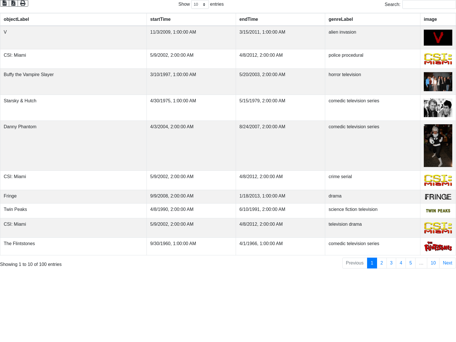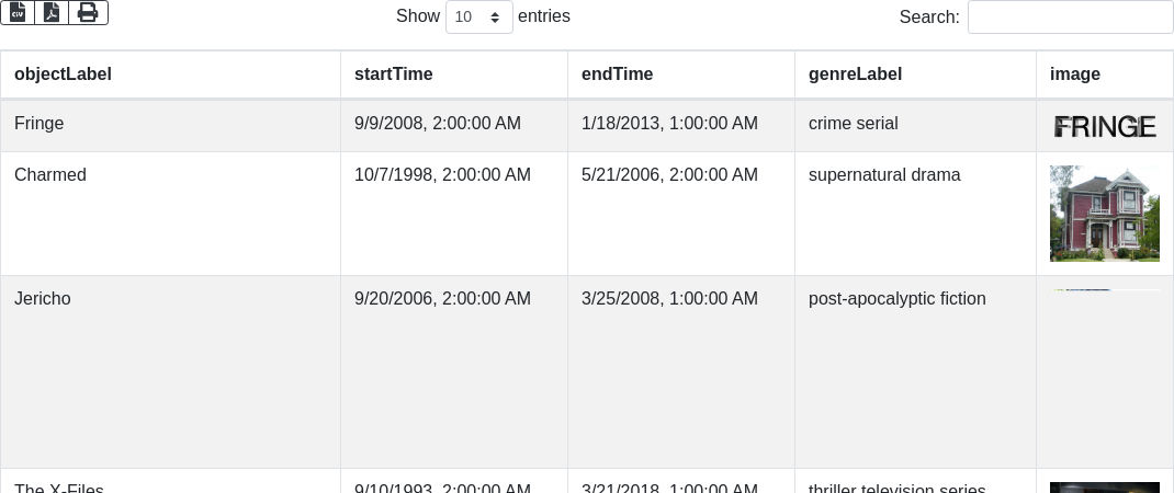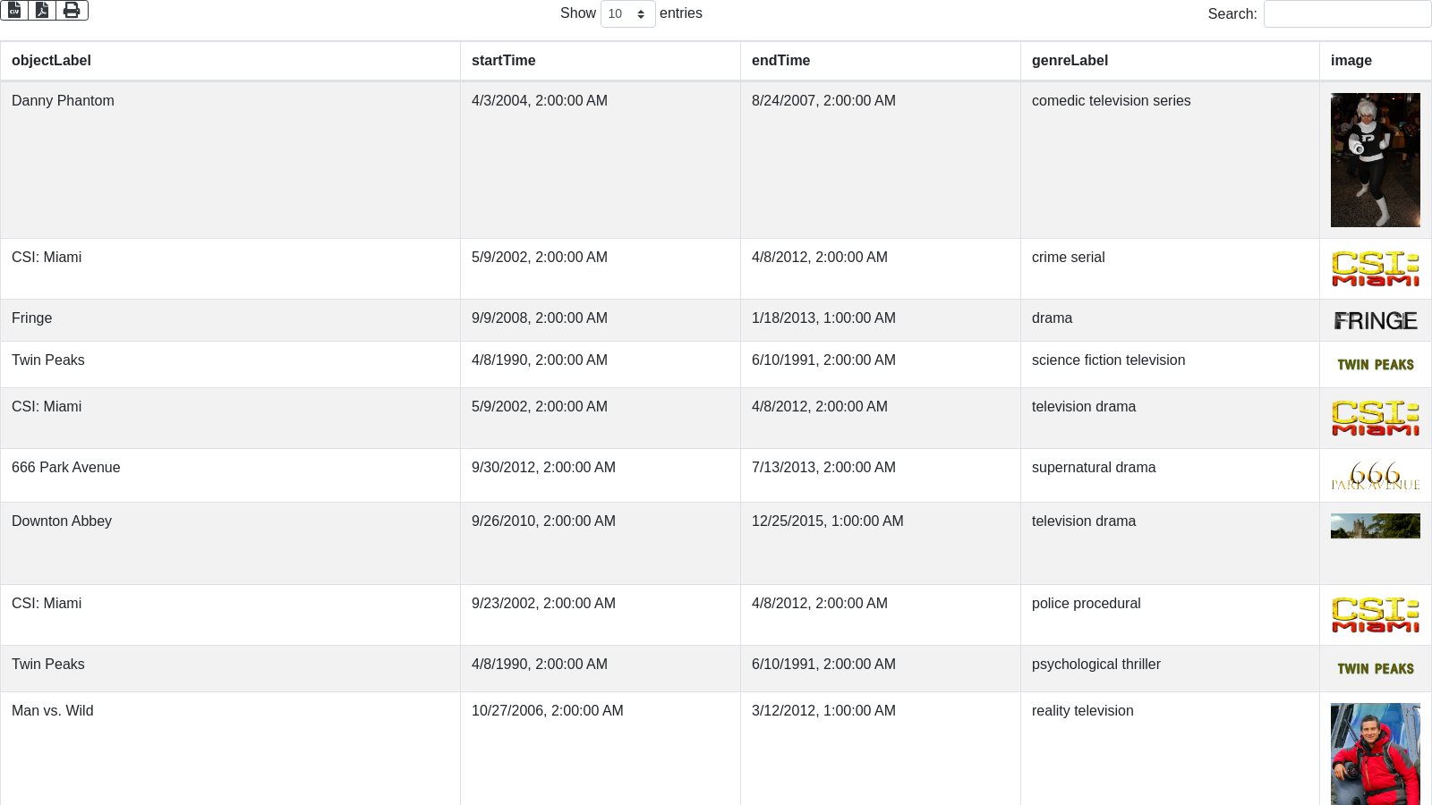 + "select DISTINCT ?objectLabel ?startTime ?endTime ?genreLabel ?image \n"