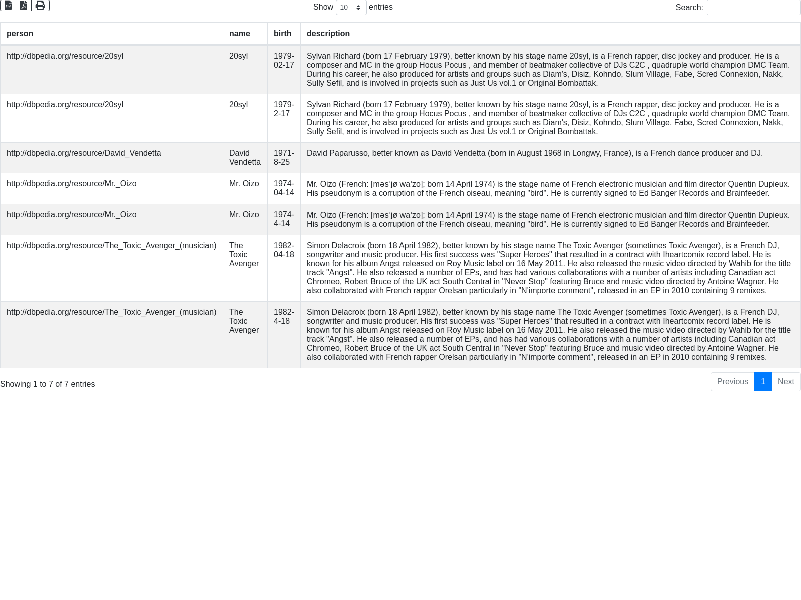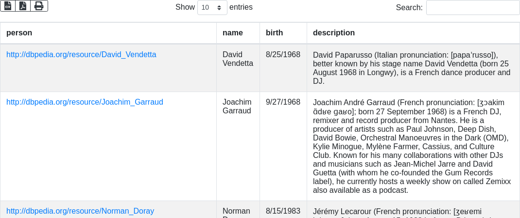 + "SELECT DISTINCT ?person ?name ?birth ?description \n"