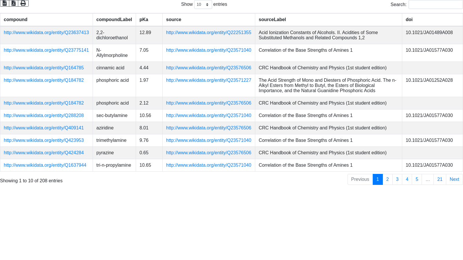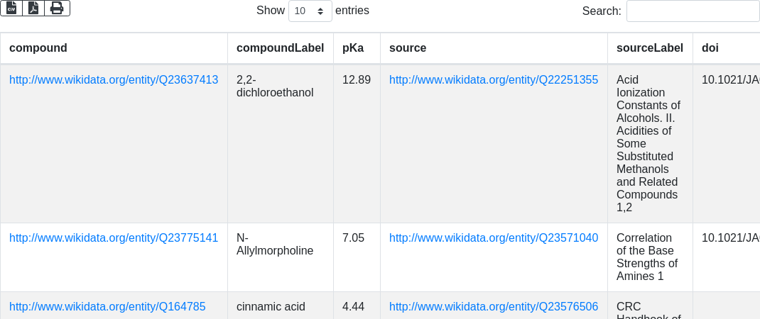 SELECT ?compound ?compoundLabel ?pKa ?source ?sourceLabel ?doi