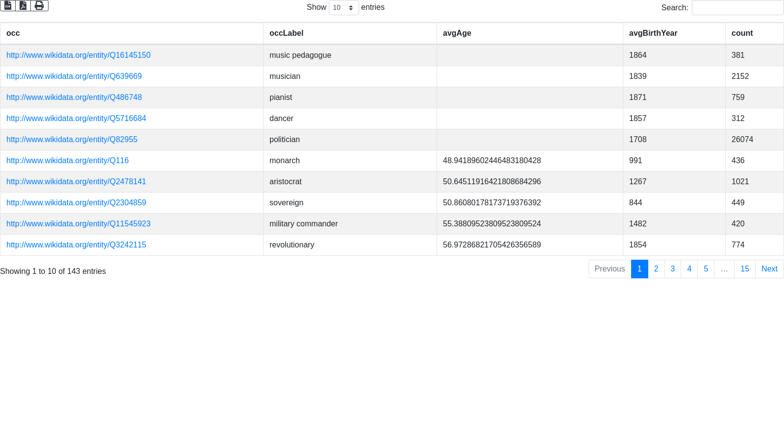 + "SELECT ?occ ?occLabel ?avgAge ?avgBirthYear ?count \n"