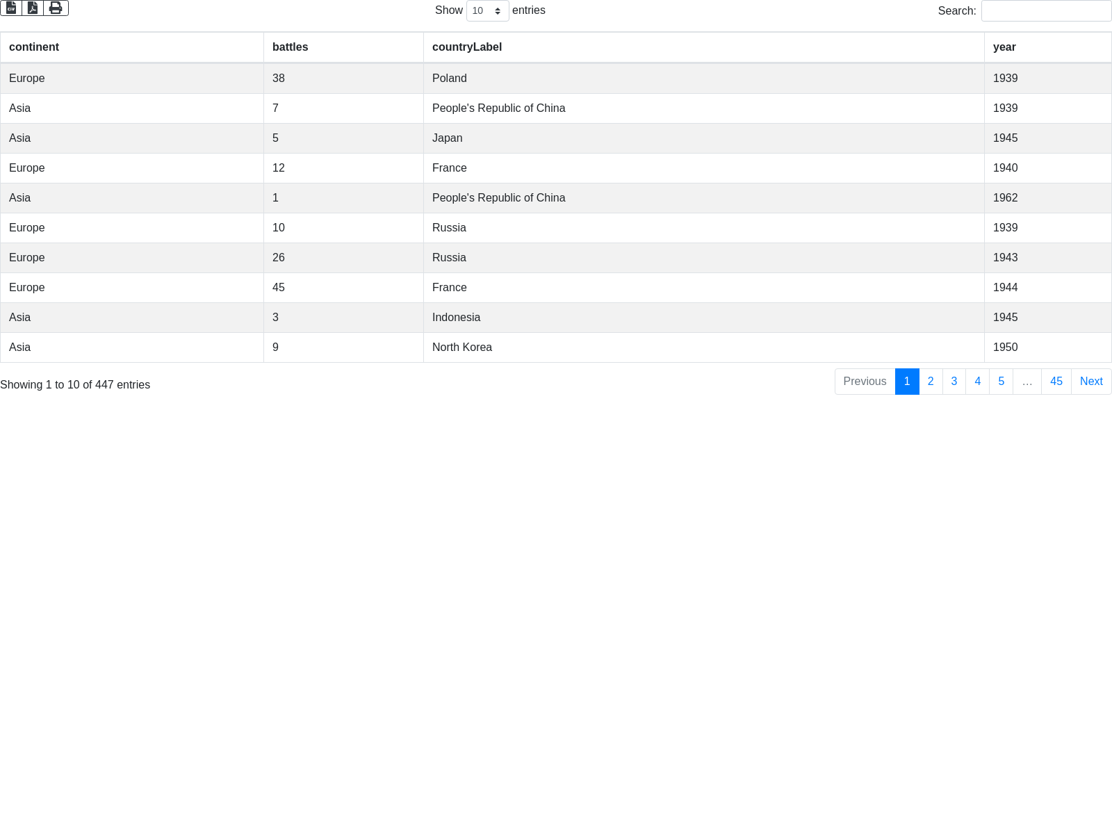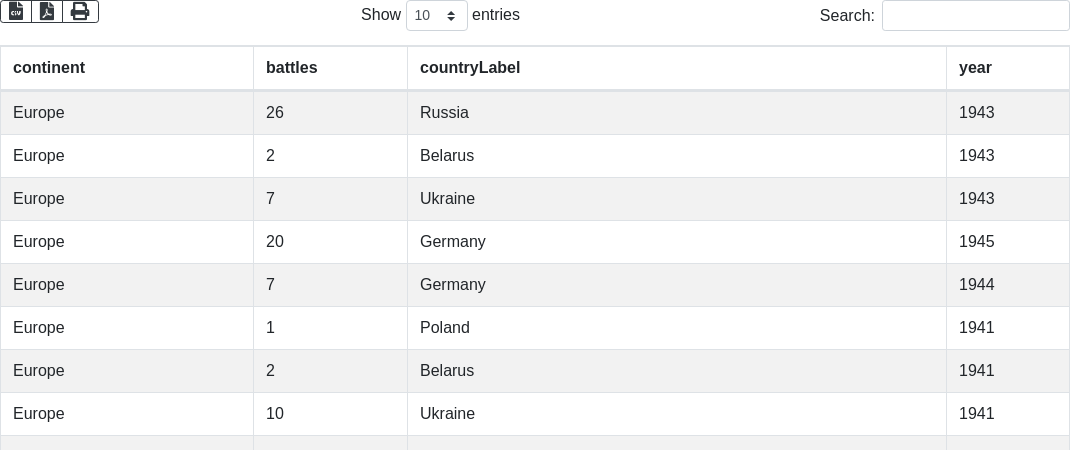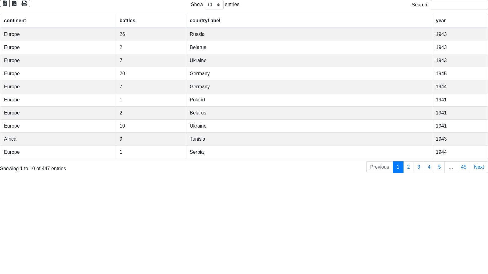 SELECT (SAMPLE(?_continentLabel) AS ?continent) (COUNT(?_country) AS ?battles) (SAMPLE(?_countryLabel) AS ?_countryLabel) (SAMPLE(?year) AS ?year) WHERE {