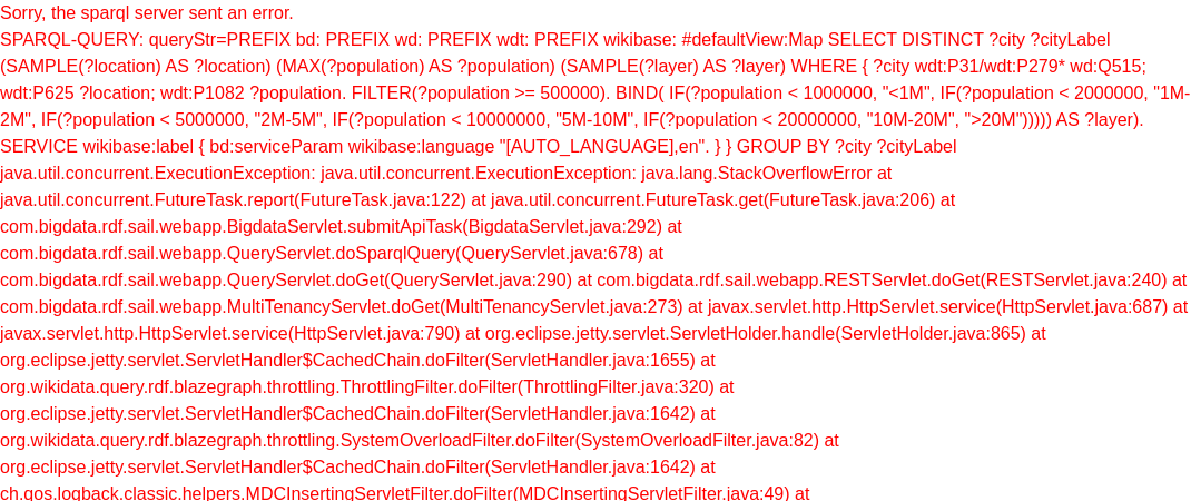 + "SELECT DISTINCT ?city ?cityLabel (SAMPLE(?location) AS ?location) (MAX(?population) AS ?population) (SAMPLE(?layer) AS ?layer) \n"