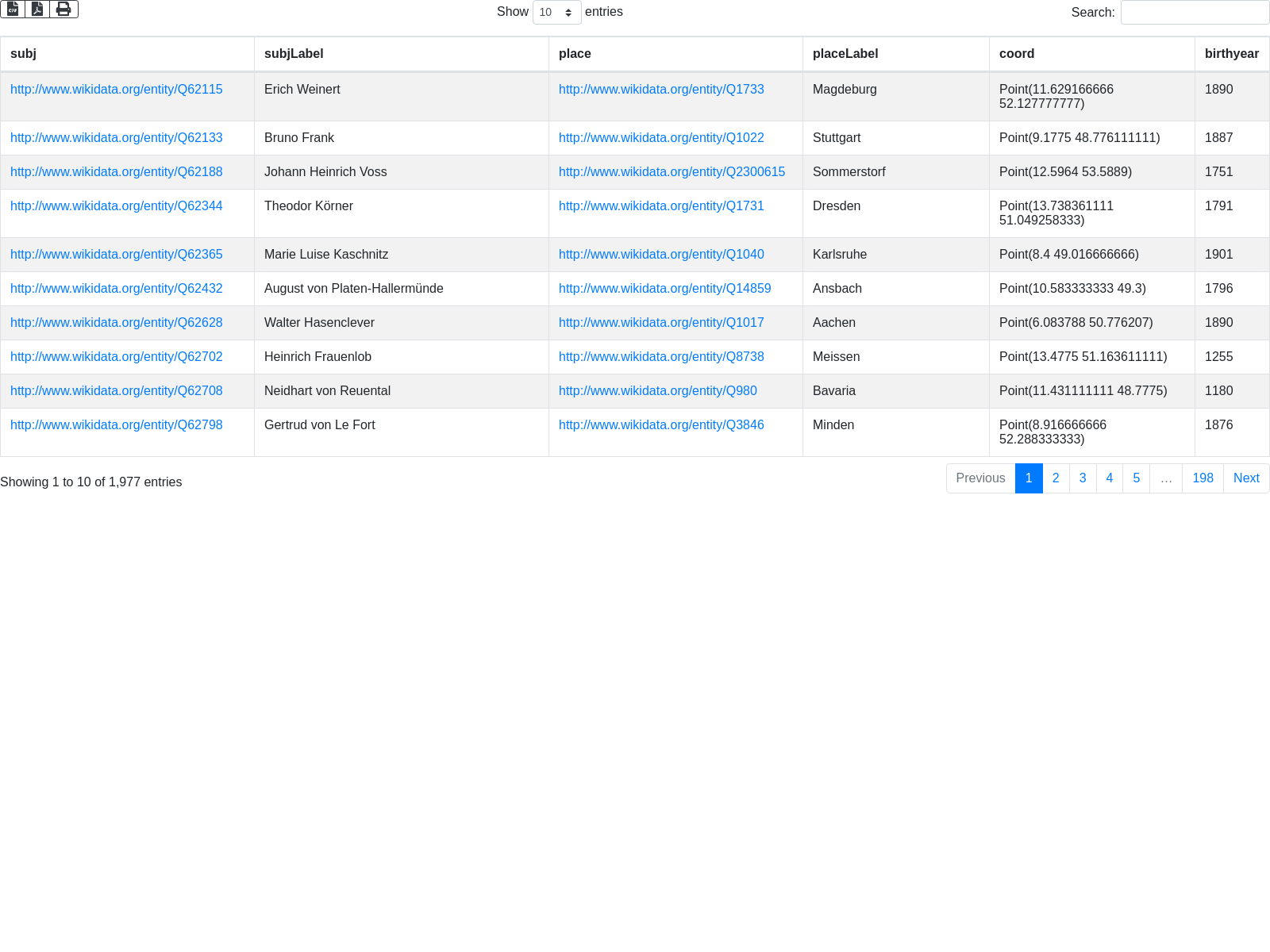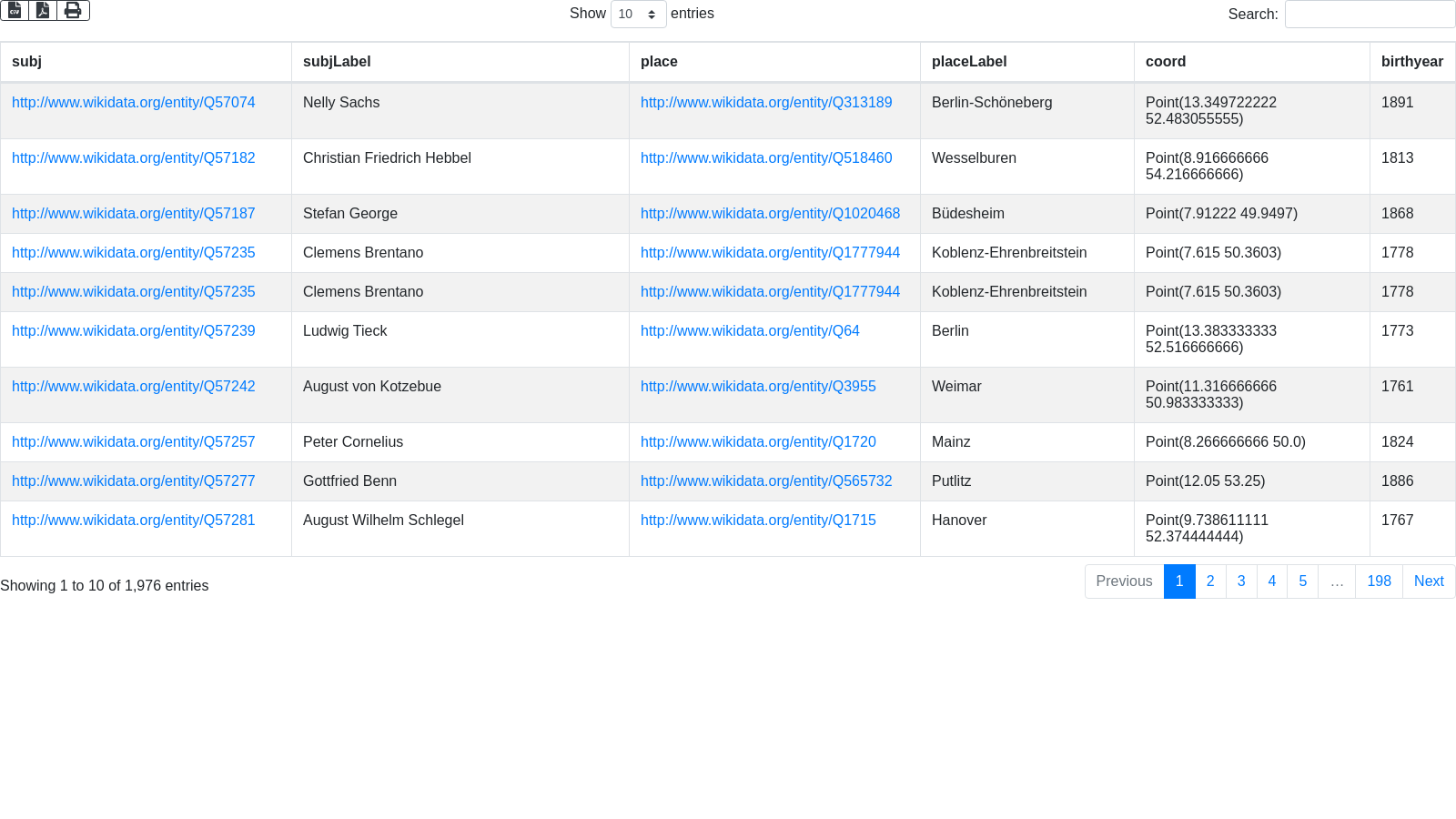'SELECT ?subj ?subjLabel ?place ?placeLabel ?coord ?birthyear '...