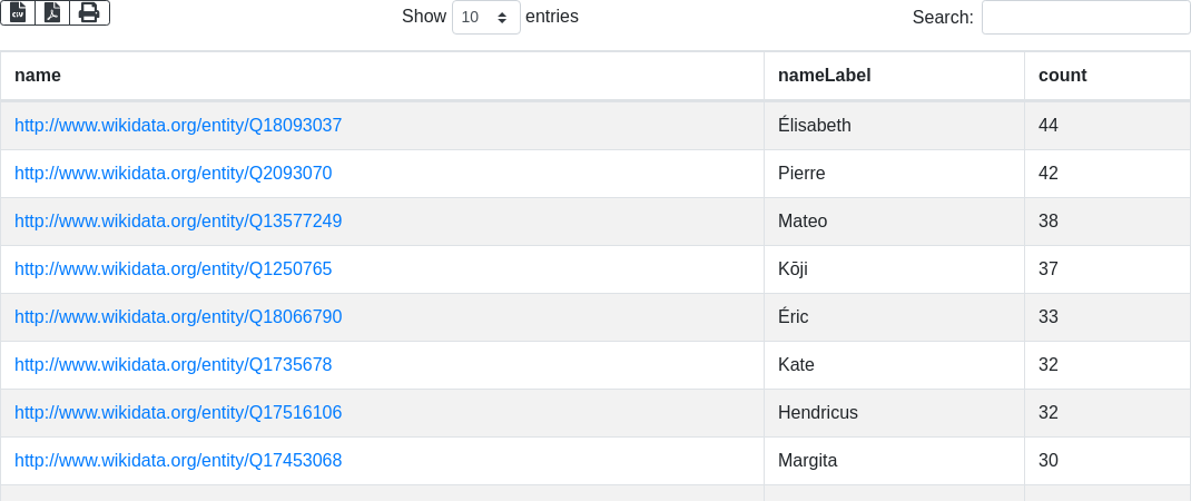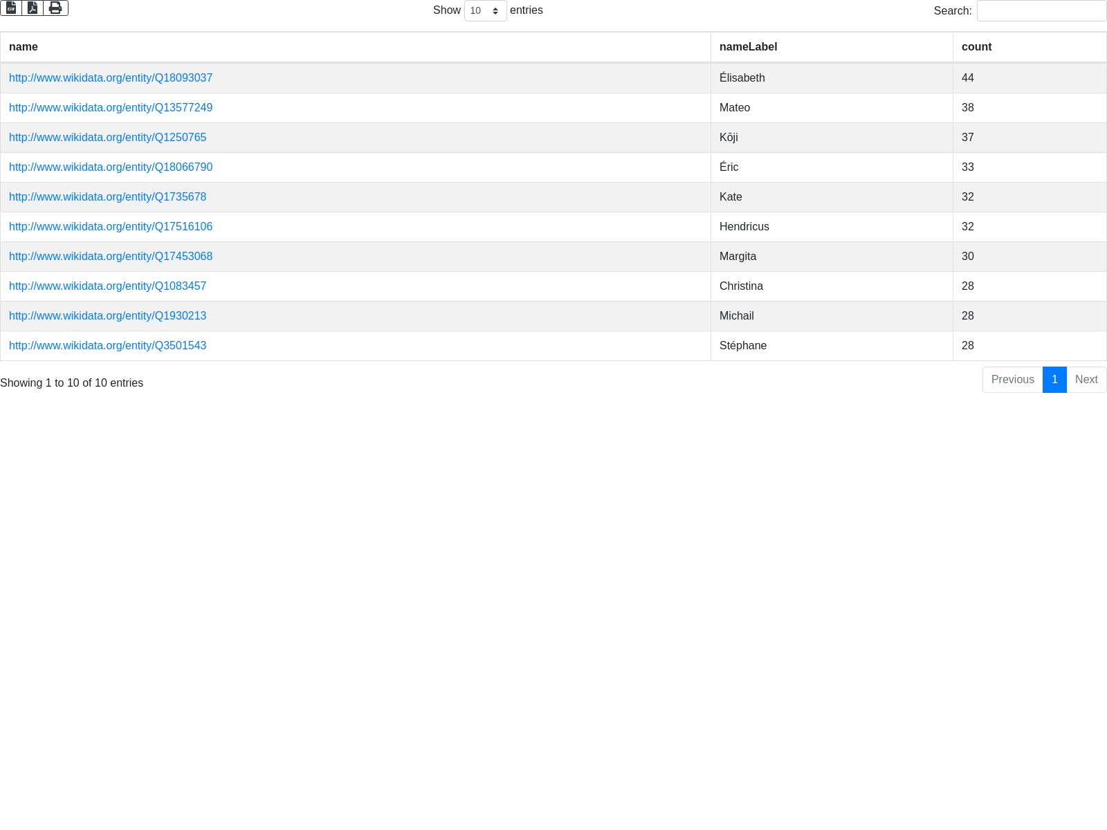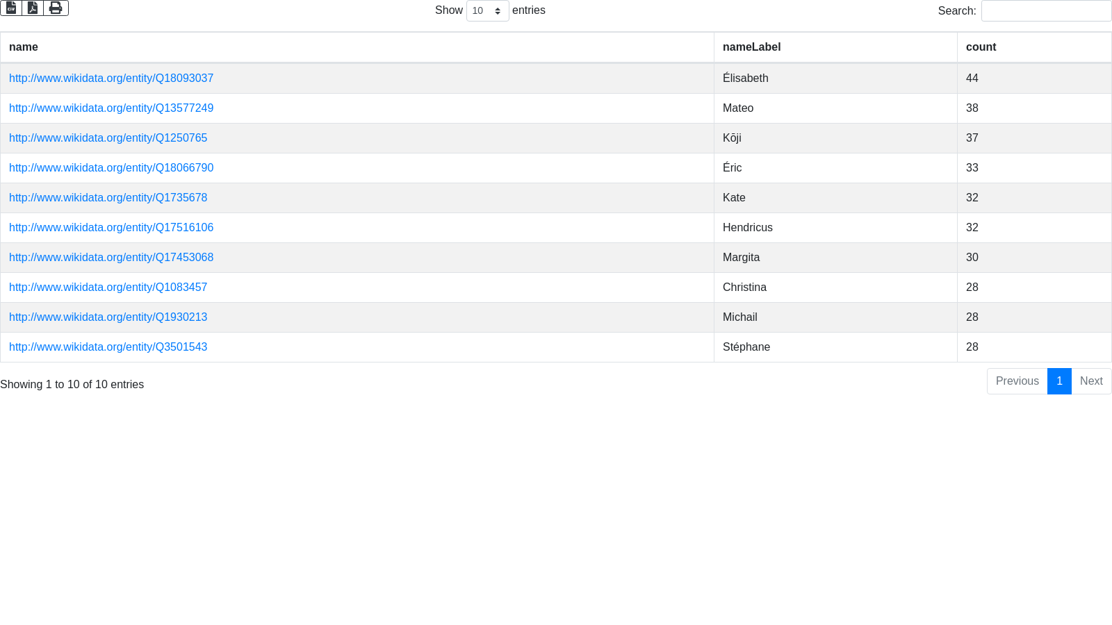 + "SELECT ?name ?nameLabel (COUNT(?otherName) AS ?count) \n"