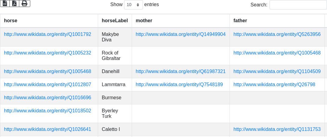 + "SELECT DISTINCT ?horse ?horseLabel ?mother ?father \n"