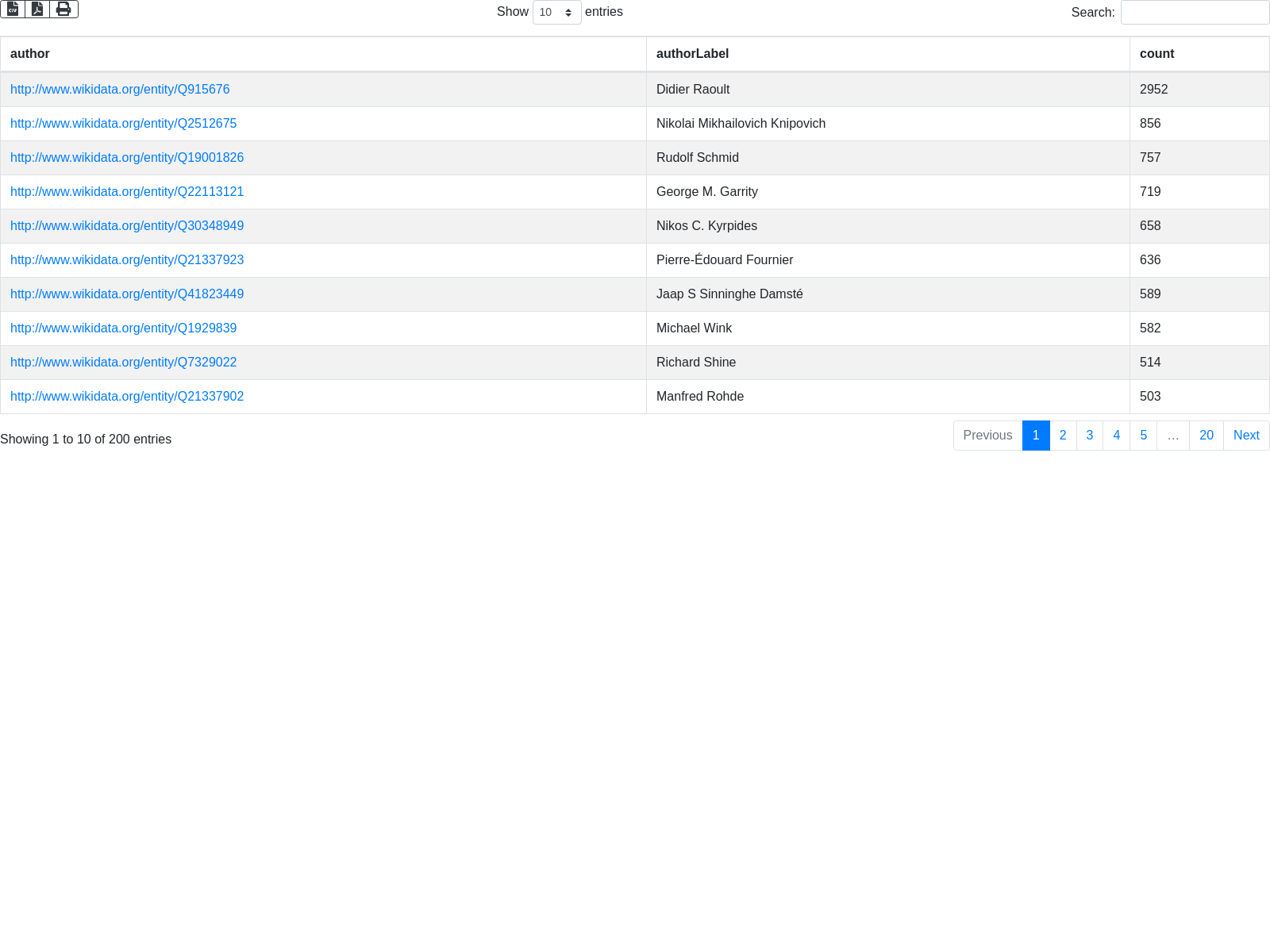 + "SELECT ?author ?authorLabel (COUNT(?paper) AS ?count) \n"