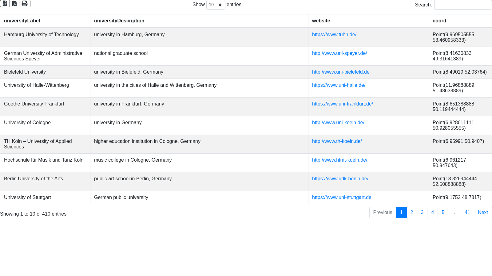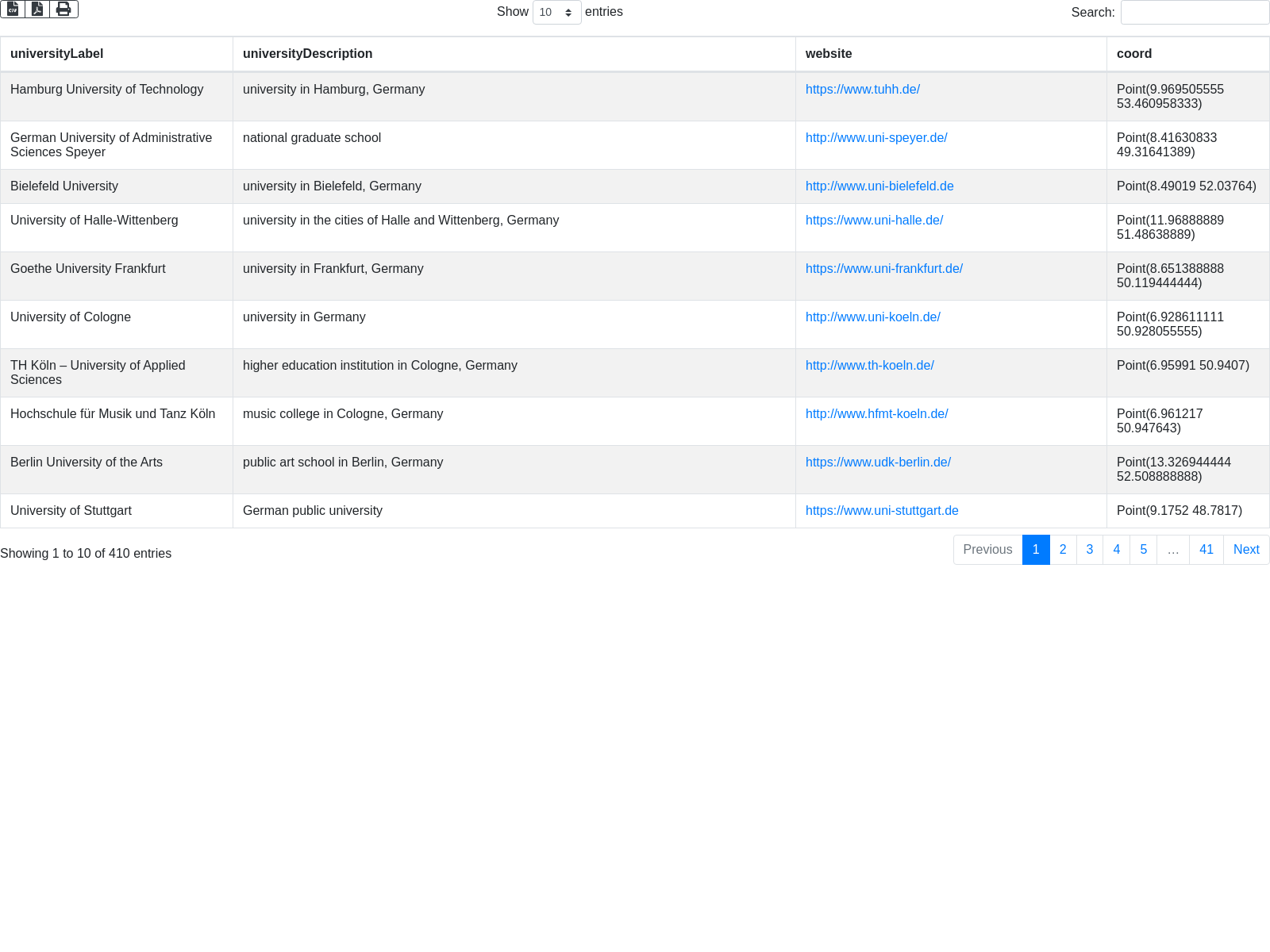 SELECT ?universityLabel ?universityDescription ?website ?coord