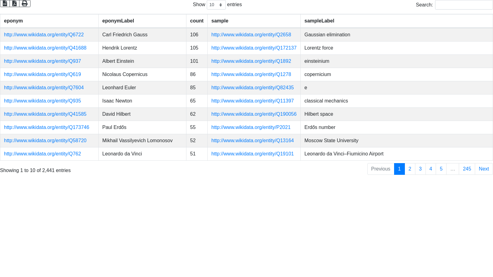 + "SELECT ?eponym ?eponymLabel ?count ?sample ?sampleLabel \n"