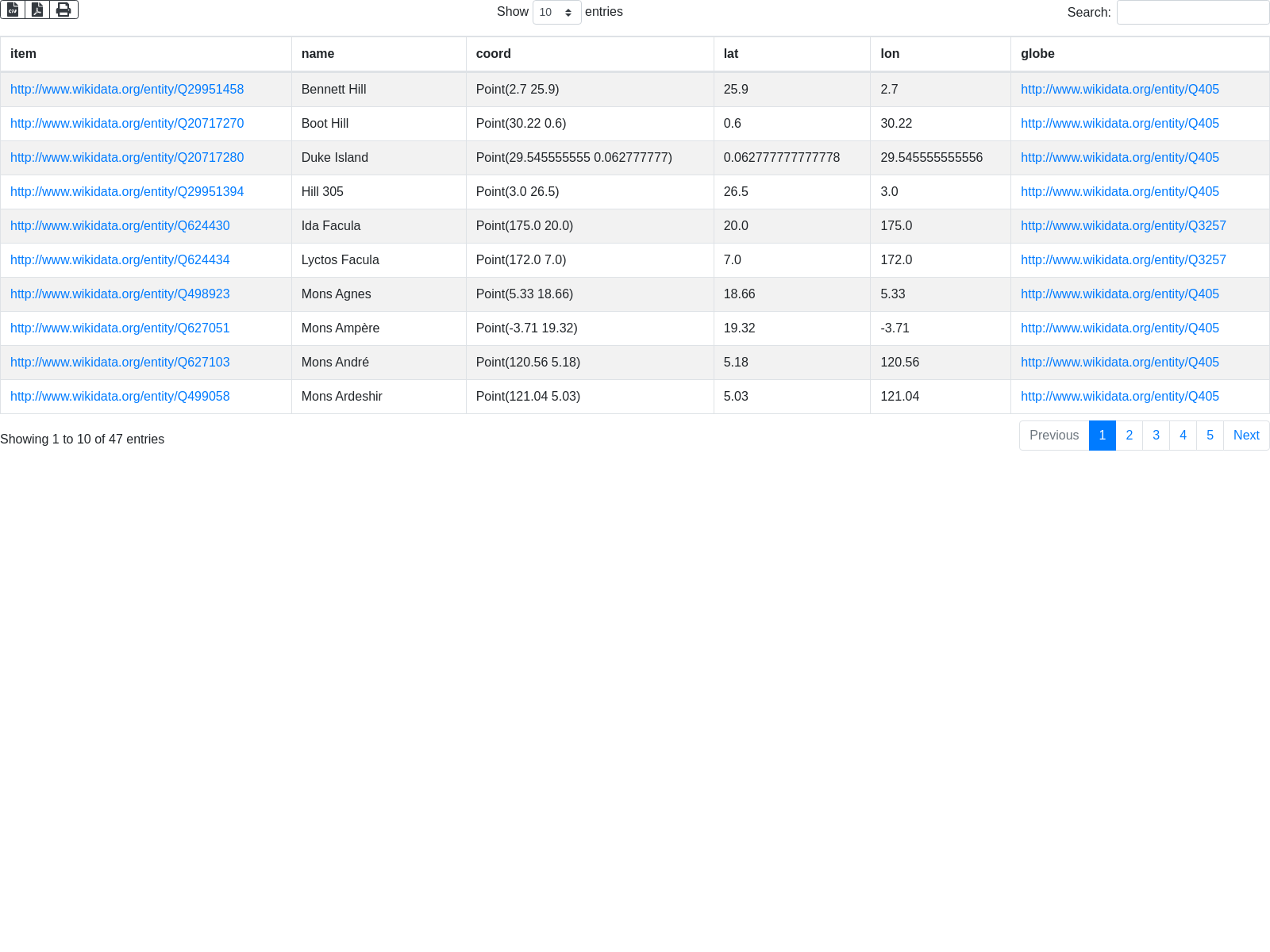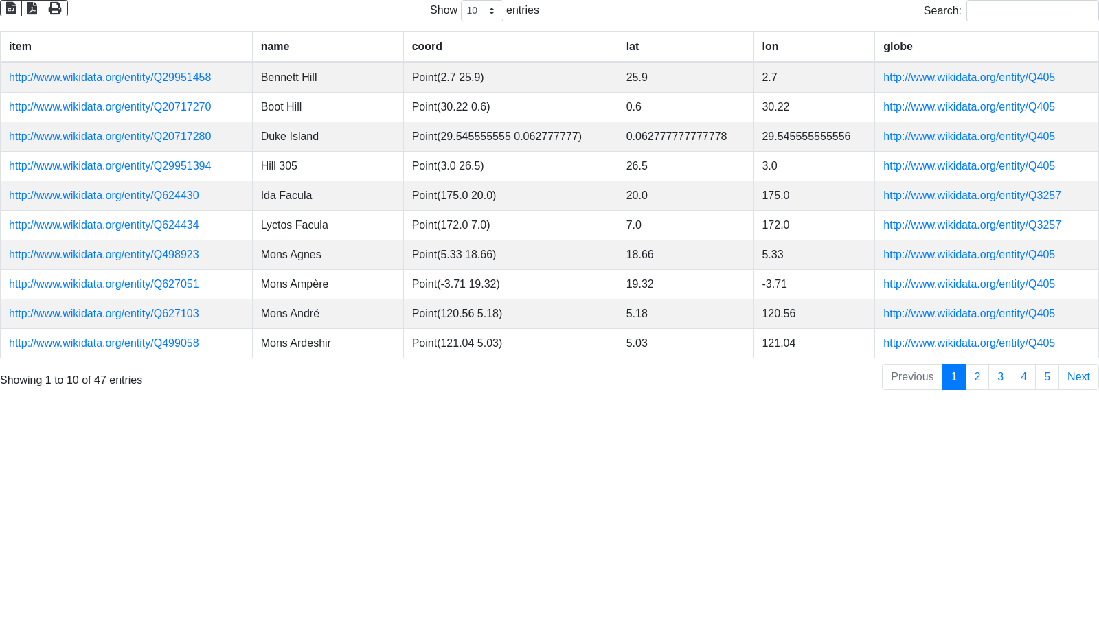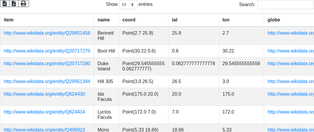 SELECT DISTINCT ?item ?name ?coord ?lat ?lon ?globe