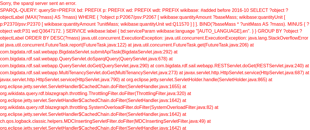 + "SELECT ?object ?objectLabel (MAX(?mass) AS ?mass) \n"