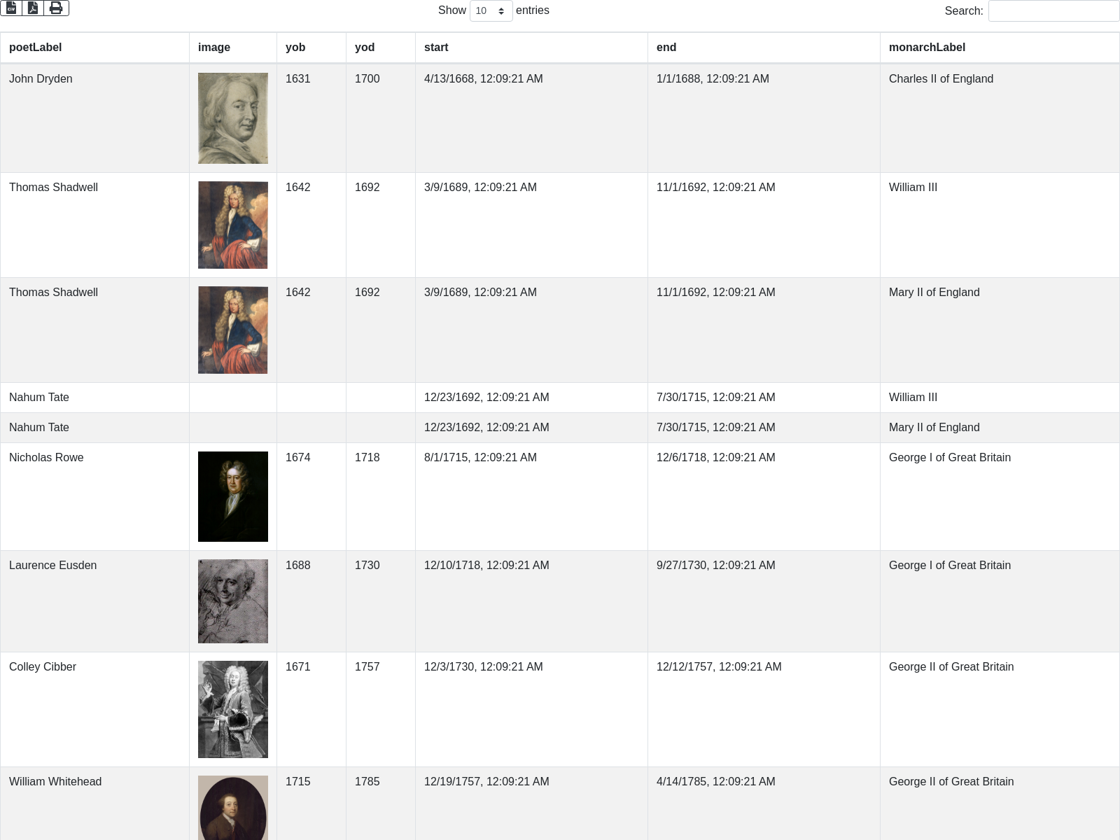 SELECT ?poetLabel ?image ?yob ?yod ?start ?end ?monarchLabel