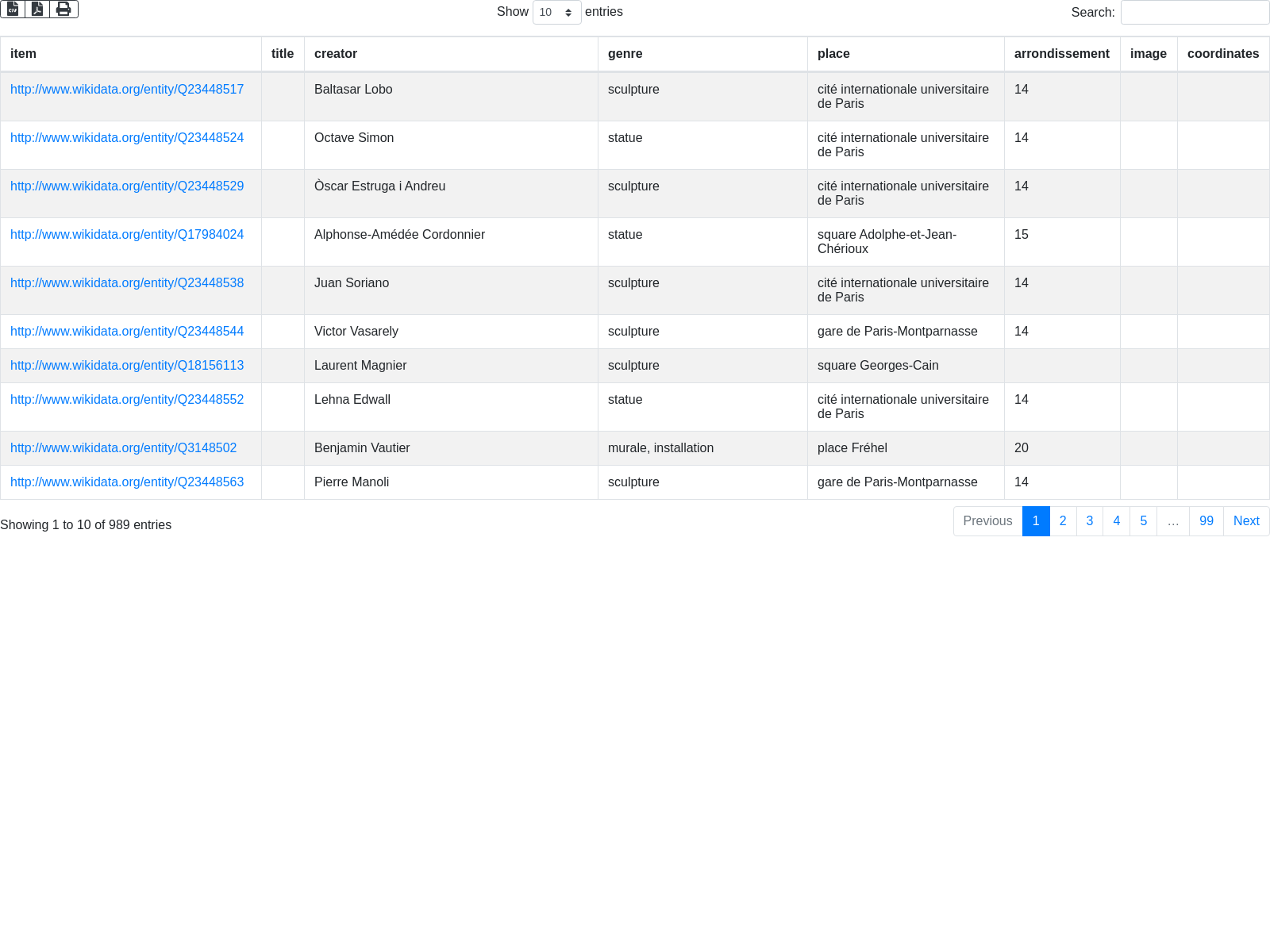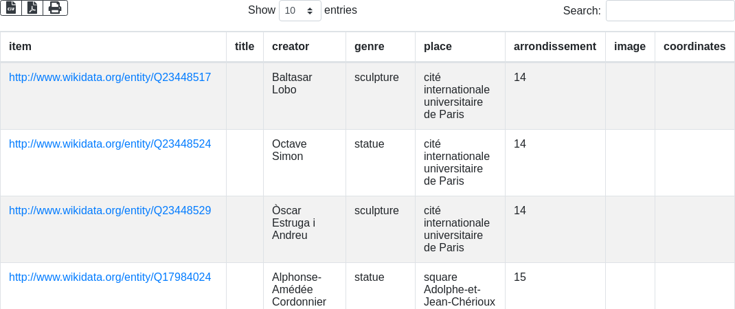 SELECT ?item ?titleL ?creatorL ?genreL ?placeL ?arr ?img ?coord