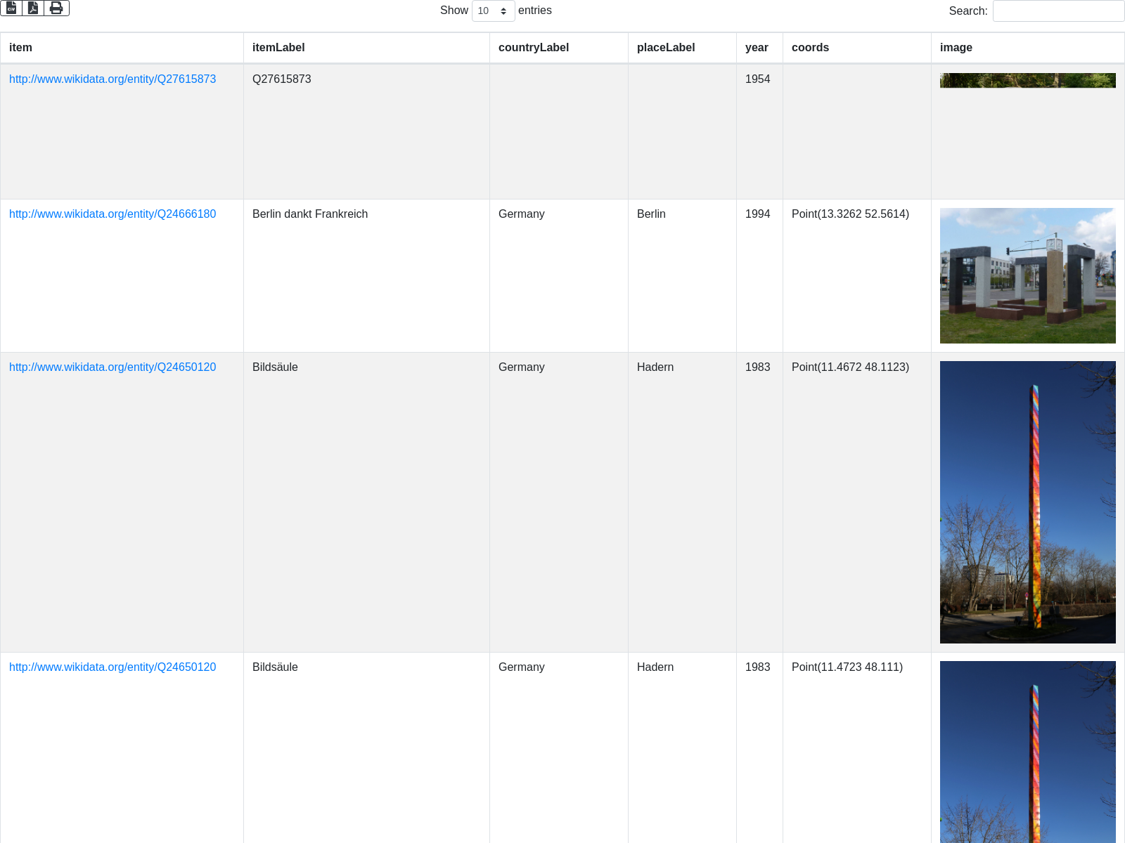 + "SELECT DISTINCT ?item ?itemLabel ?countryLabel ?placeLabel (YEAR(?date) as ?year) ?coords ?image \n"
