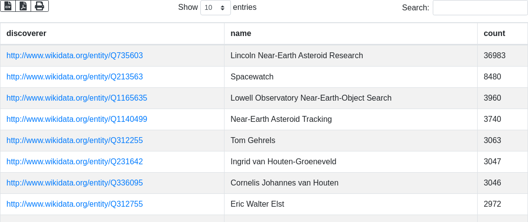 + "SELECT ?discoverer ?name (COUNT(?asteroid) AS ?count) \n"