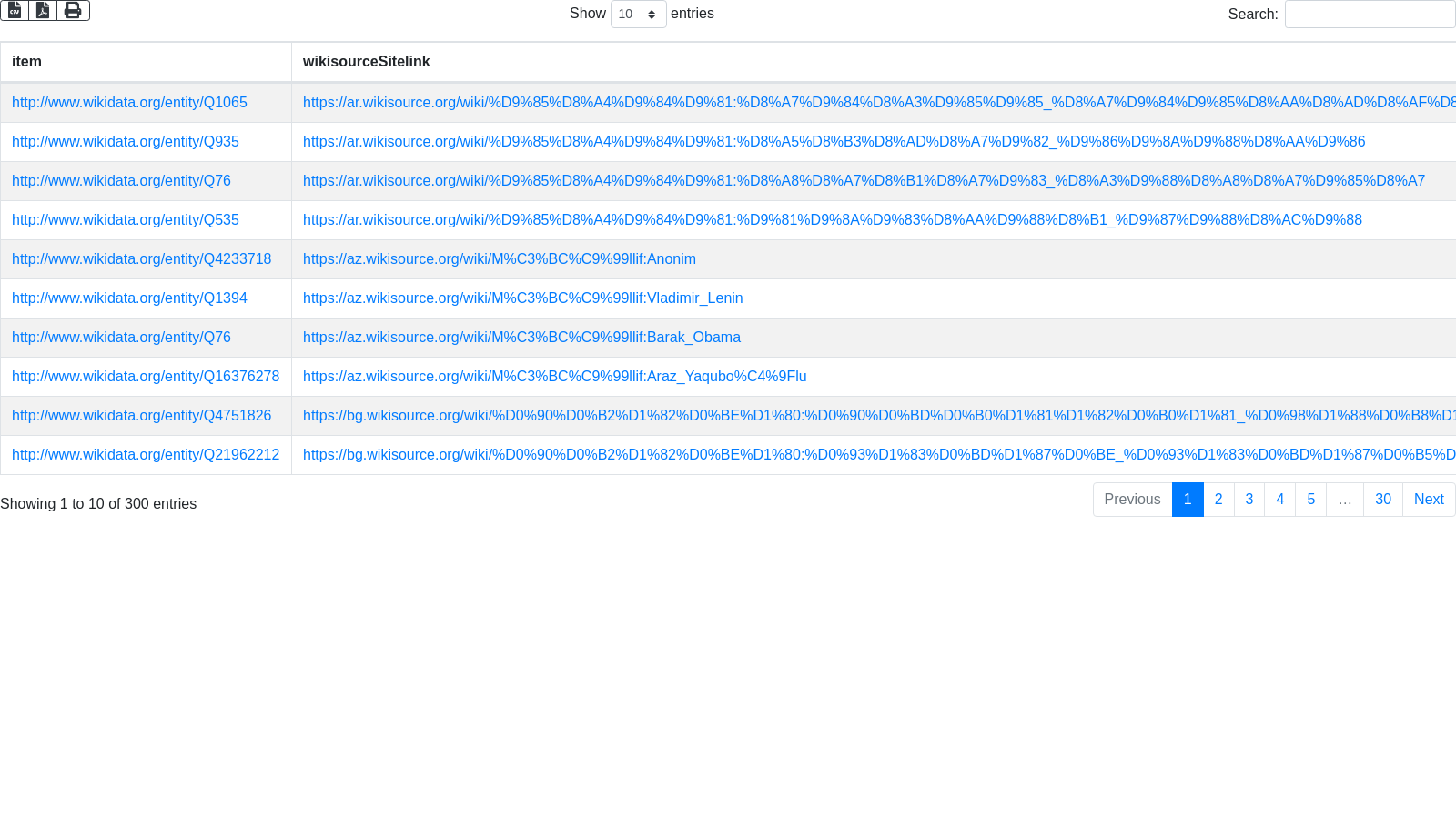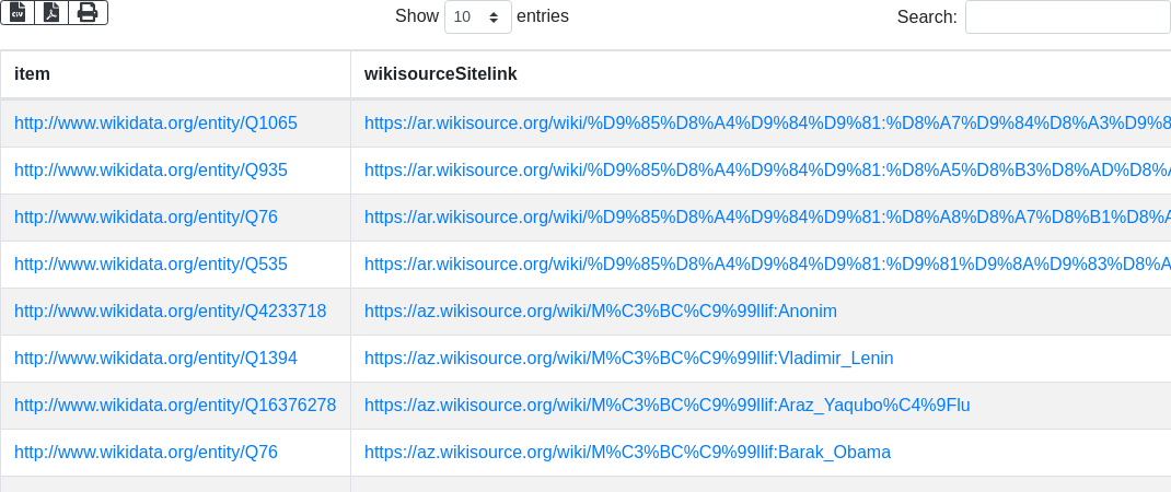 SELECT DISTINCT ?item ?wikisourceSitelink ?wikisourceLanguage WHERE {